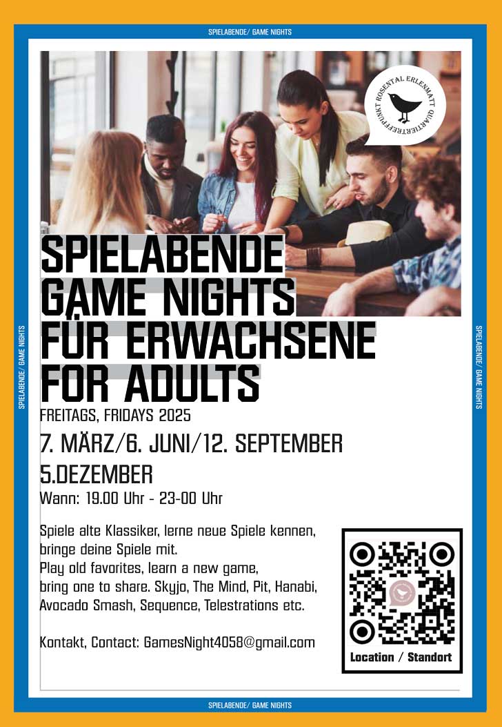 An den Spielabenden für Erwachsene kannst Du neue Spiele entdecken oder alt bekannte wieder aufgreifen- mit viel Spass, Freude und netten Mitspieler*innen.