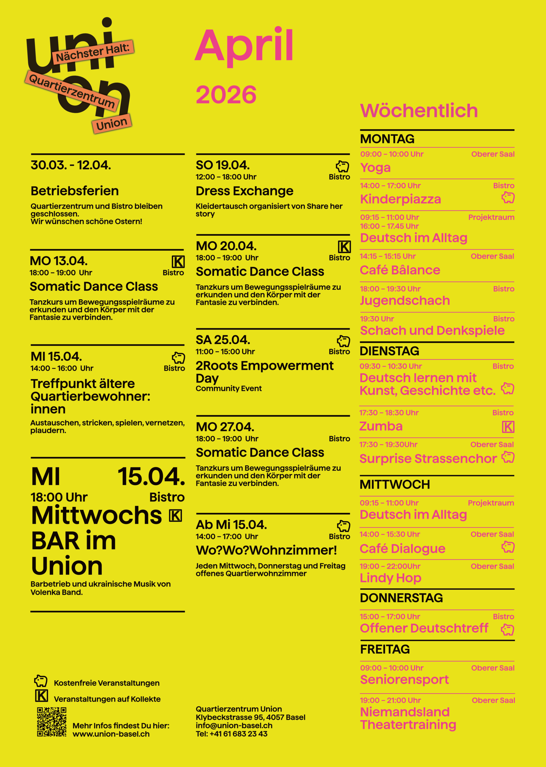 Hier kannst du dich austauschen und informieren, Kurse belegen, den Horizont erweitern, mitmachen oder auch mitgestalten und Neues entstehen lassen, andere treffen, Tapas essen, Deutsch lernen, Tanzen, Singen, Räume mieten, Kaffee trinken, Bücher ausleihen, Feste feiern und Veranstaltungen geniessen oder einfach nur sein. Alles an einem Ort, im Quartierzentrum Union.